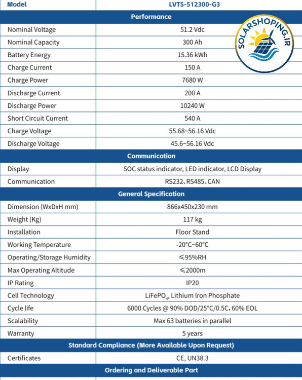 در نهایت، LVTS-512300-G3 تعریف جدیدی از یک راهکار ذخیرهسازی انرژی با ظرفیت بالا و قابل نصب روی زمین ارائه میدهد. این واحد با ترکیبی از ویژگیهای ایمنی پیشرفته، چگالی انرژی استثنایی و طراحی کاربرپسند، برای کاربردهایی که نیاز به تحویل برق قابل اعتماد، قابلیت جابجایی و نگهداری آسان دارند، بسیار مناسب است. این دستگاه نشاندهنده پیشرفت قابل توجهی در فناوری باتری است که برای پاسخگویی به چالشهای انرژی زیرساختهای مدرن امروزی طراحی شده و در عین حال راه را برای نوآوریهای آینده هموار میکند.